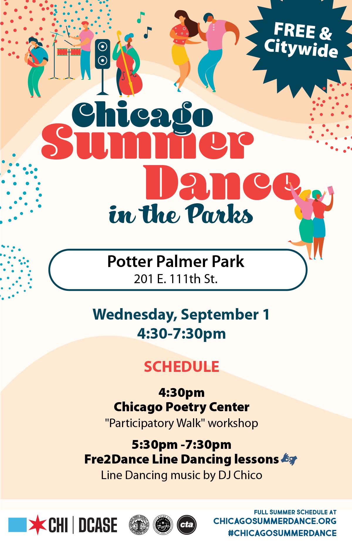 The Chicago Poetry Center is partnering with the City of Chicago Department of Cultural Affairs and Special Events to bring poetry to Summer Dance. CPC Poet in Residence Timothy David Rey will be kicking off two neighborhood Summer Dance events with a free and public walking poem workshop. CPC Student poets from neighborhood schools will perform immediately after the workshop and before the dance lesson begins.