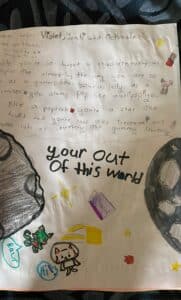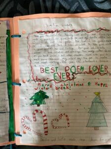 On this day, students in Mrs. Murphy’s class read their Recipe Poems aloud, receiving snaps and compliments. Ms. O’Reilly’s class had gifted me with a book of personally written poetic notes full of similes and color, as well as a Christmas tree ornament, and a candle that smells like hot cocoa. Such wonderfully memorable souvenirs of our time together – I am “eternally grateful!”