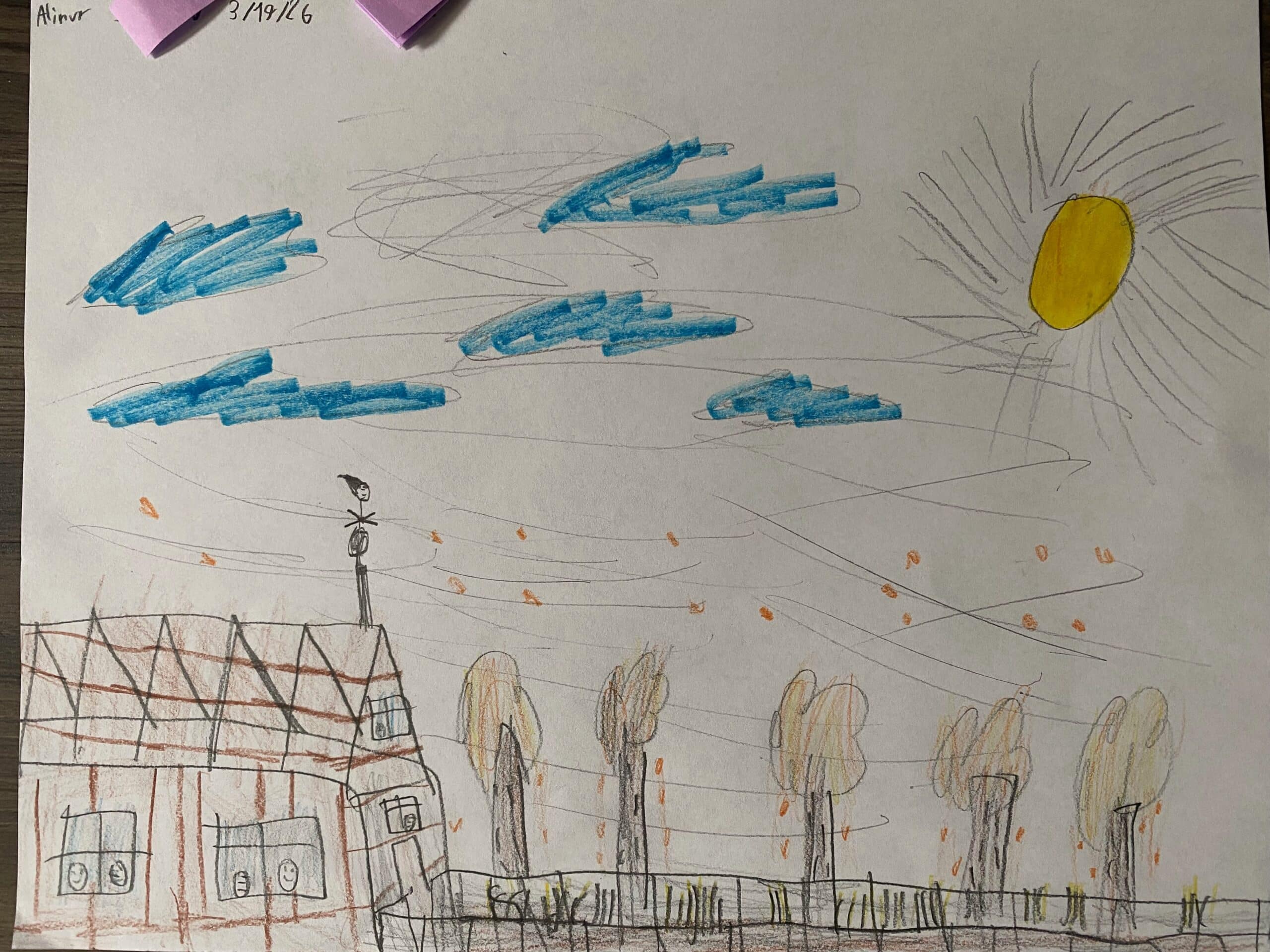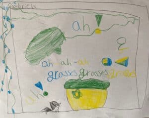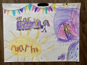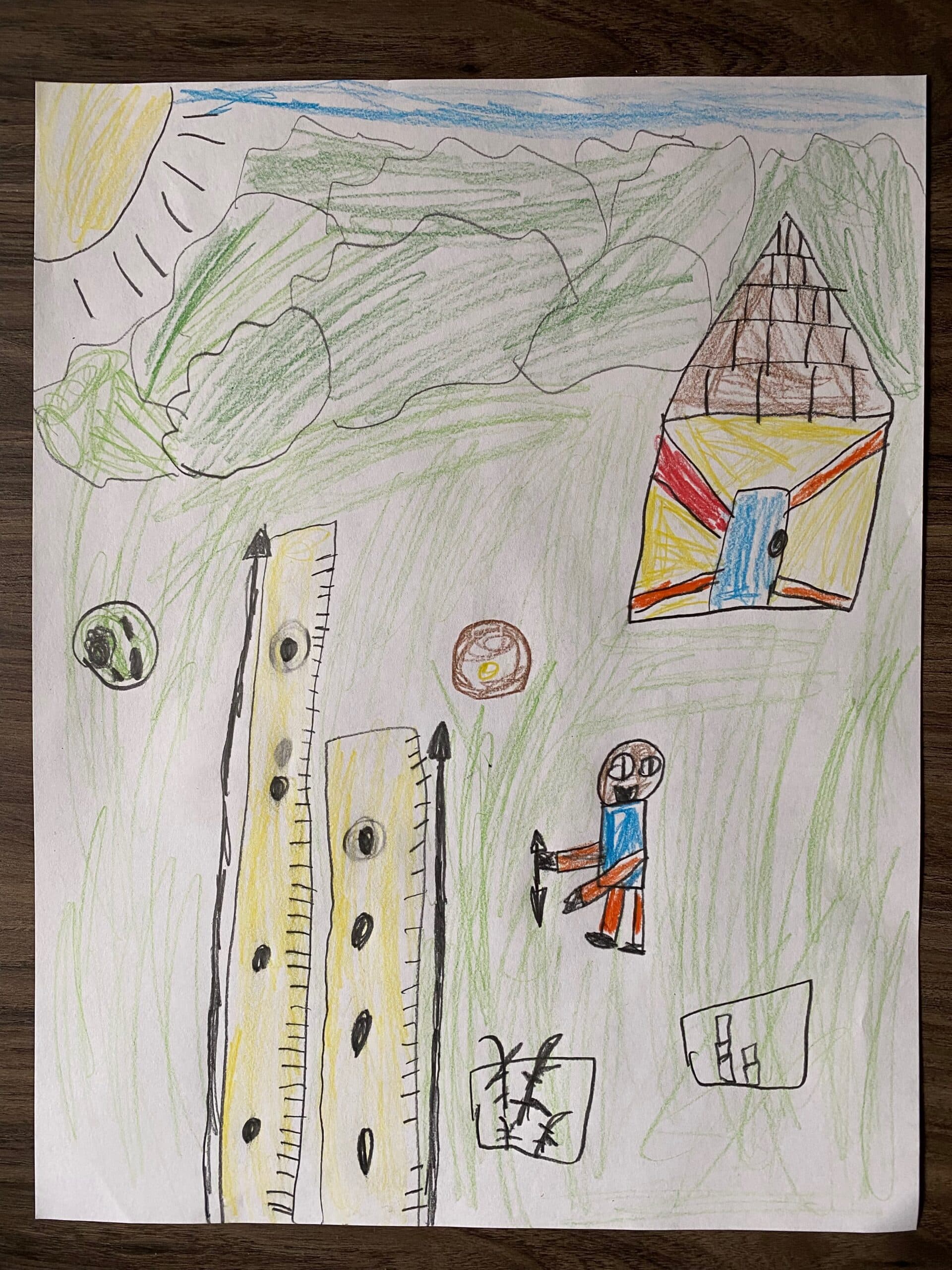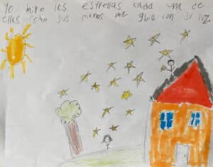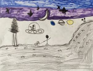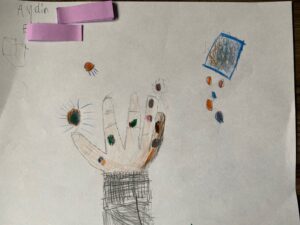 My 6th sessions with Swift 2nd and 3rd graders landed on the week of parent-teacher conferences, and just on the cusp of spring break. I decided to ask students to draw instead of write, as an introduction to the concept of IMAGERY. We talked about images, pictures, and portraits, and how poets and other creative writers use words to help us see images with our mind’s eye. I had pre-selected and typed short poems or excerpts from longer poems which I cut into strips. Each student selected a strip without knowing the words that were written on the other side. Using colored pencils, markers, and crayons, young artists created these images and more from words of poets. Enjoy!