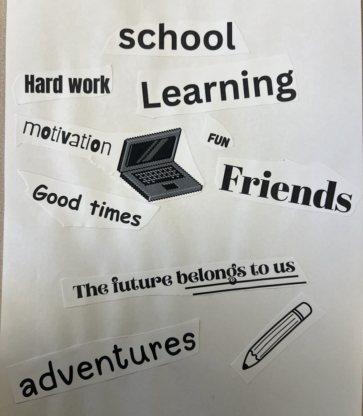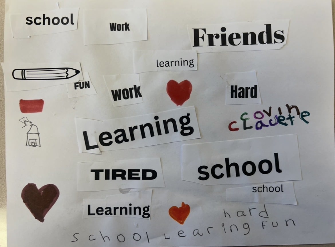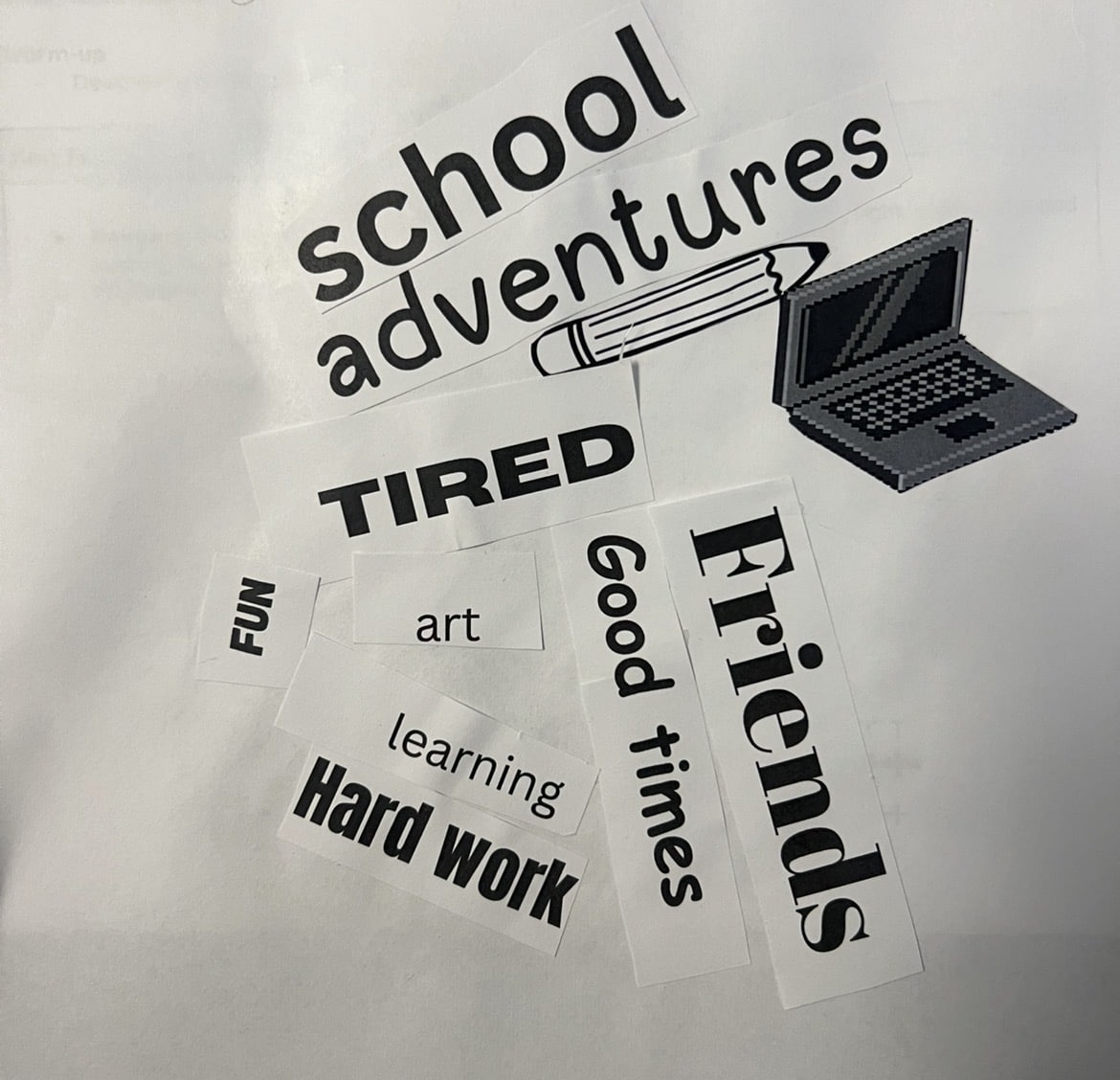 After analyzing Douglas Kearney’s poem “Of Agricultural Work” we discussed the ways poets can use visual elements within the sizing and placement of words to convey an impactful message. I created a single document full of words in various fonts and sizes, bold, italics etc. associated with general feelings around being at school. Students cut out and arranged them on a new page in their own ways, to demonstrate their feelings and thoughts about being in school.