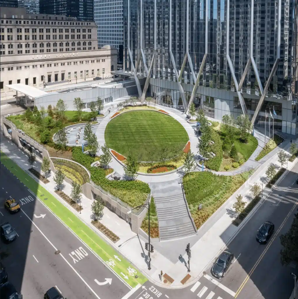 The Green at 320 is located at 320 S. Canal St. The main staired entrance to the park is on the corner of Clinton and Van Buren with an ADA-accessible ramp off of Clinton. The park is located one block north of the Clinton Blue Line.