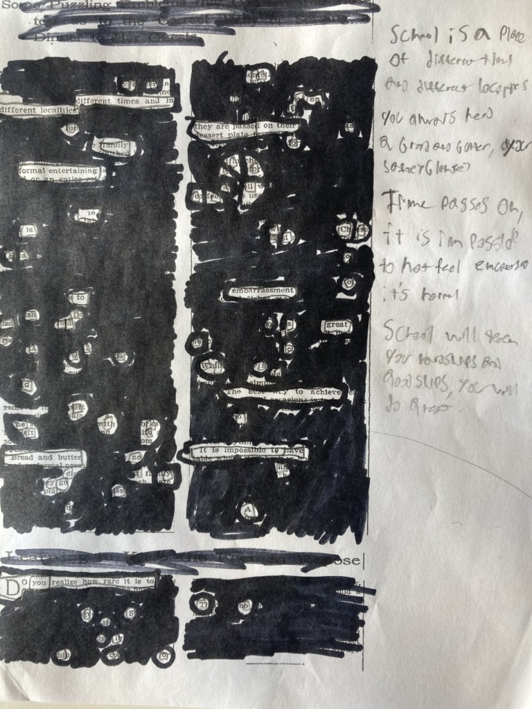 Students in Mrs. McClain’s class crafted Blackout Poetry from an article. Student work represented by:
